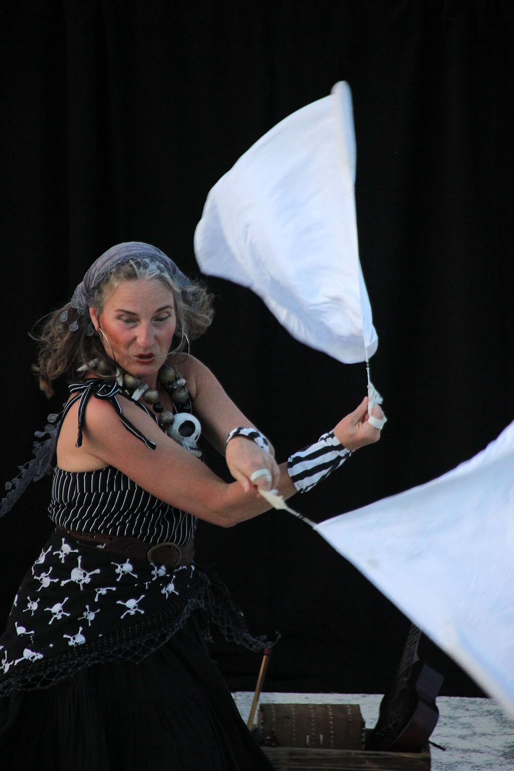 Predstava se je začela z gusarji, ki so z zemljevidom iskali zaklad, a jim je vedno nekaj šlo narobe. Kamorkoli so šli, so jih zasledovale pustolovščine: najprej so se soočili z nevihto, nato so se spopadli z galebi, pred koncem pa so preganjali sluzasto žival v blatnem morju. Ne glede na vse ovire so vedno znova uspešno pristajali na varnem. A zasluga za to ni bila le njihova, saj jim je pomagalo morje oziroma otroci, ki so se udeležili predstave: vračali so jim topovske krogle, delali valove z rokami ter navdušeno občudovali žonglerske spretnosti izvajalcev. Za zaključek pustolovskega večera so se otroci lahko fotografirali z gusarji.