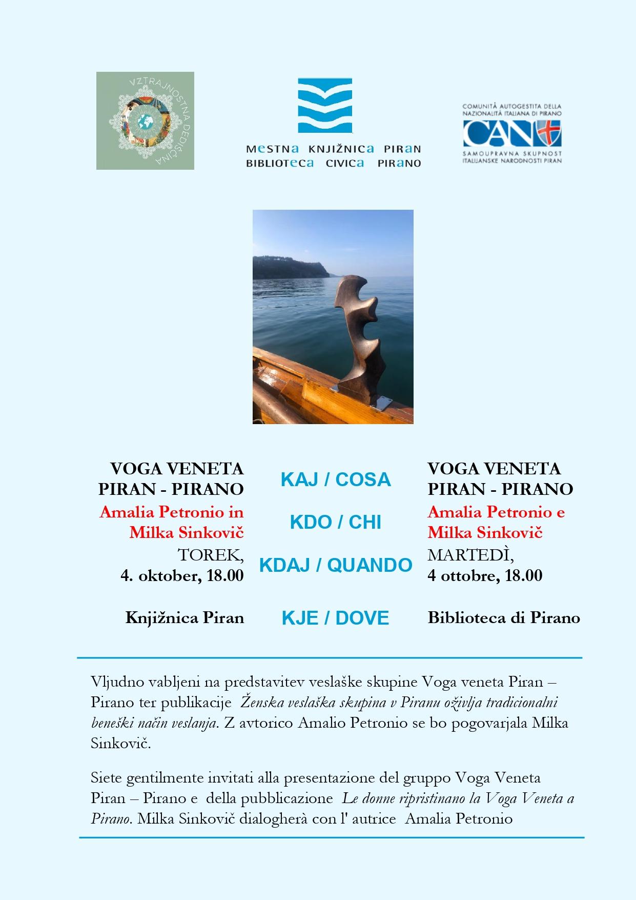 V Mestni knjižnici Piran smo prisluhnili predstavitvi veslaške skupine Voga Veneta Piran – Pirano ter publikacije Ženska veslaška skupina v Piranu oživlja tradicionalni beneški način veslanjaZ avtorico Amalio Petronio se je pogovarjala Milka Sinkovič.