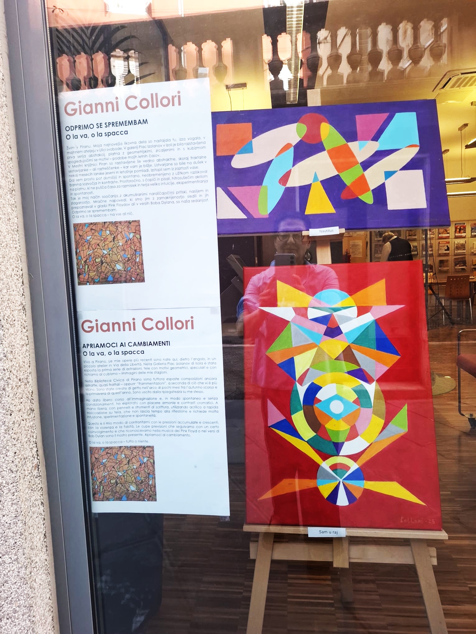 Včeraj, 15. aprila, je v piranski enoti Mestne knjižnice Piran potekalo odprtje likovne razstave Giannija Collorija z naslovom Odprimo se spremembam: o la va, o la spacca. Razstavljene abstraktne sestavljanke ali raztreščenke so bile ustvarjene na dušek v nekaj mesecih lanske jeseni in letošnje pomladi. Pri ustvarjanju je slikar dal prosto pot domišljiji in spontano, neobremenjeno in z užitkom raziskoval barvna sozvočja in kontraste. Slike so nastale prostoročno s čopiči in pisali, hitrosušečim akrilom na platnu, ki ne pušča časa za razmislek in terja veliko intuicije, eksperimentiranja in spontanosti. Na ta način se avtor sooča z akumuliranimi naraščajočimi pritiski, nasiljem in zlaganostjo.
